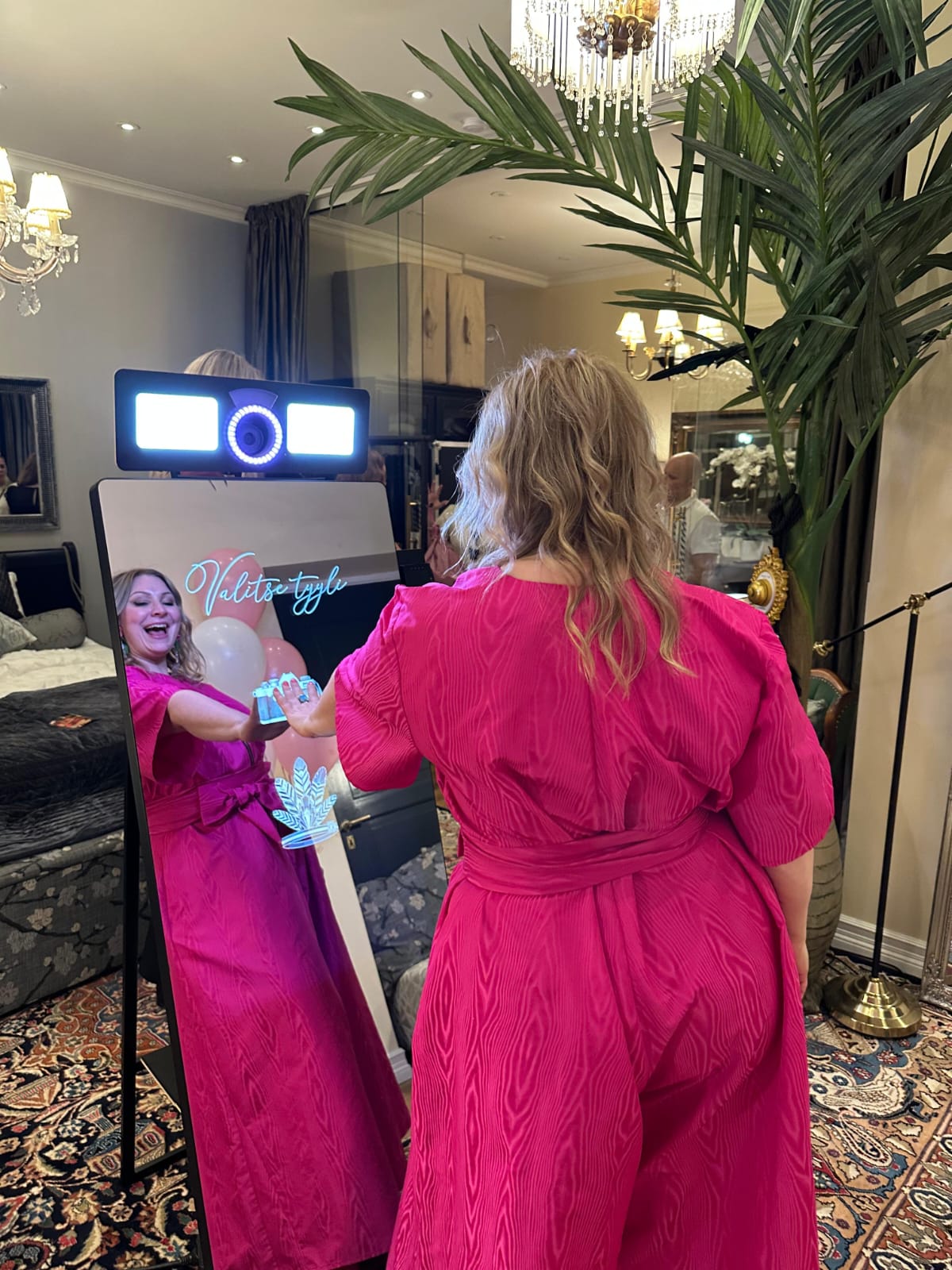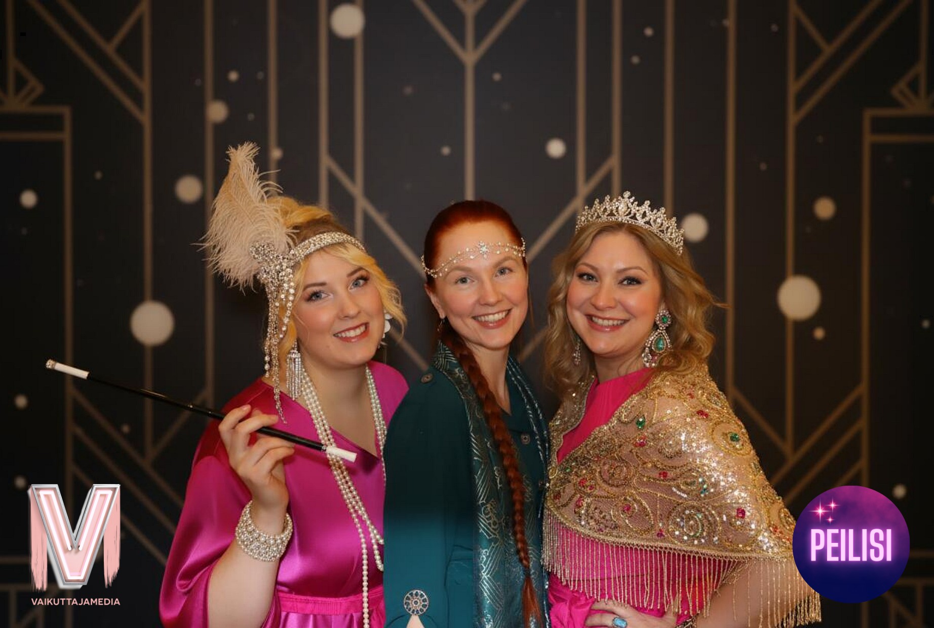 Kuvausseinänä meillä toimi Peilisi-kuvauspeili, joka osoittautui super suosituksi ohjelmanumeroksi! Peilin kautta voi ottaa kuvia erilaisilla teemoilla. Meillä oli käytössä kolmen kuvan setti sekä yhden kuvan, jossa ennaltamääritysti tekoäly loi vieraille 20-luvun teemaiset asusteet ja taustan. Vieraat rakastivat tätä! Emmekä yhtään ihmettele! Kuvauspisteelle oli jatkuvasti jonoa.