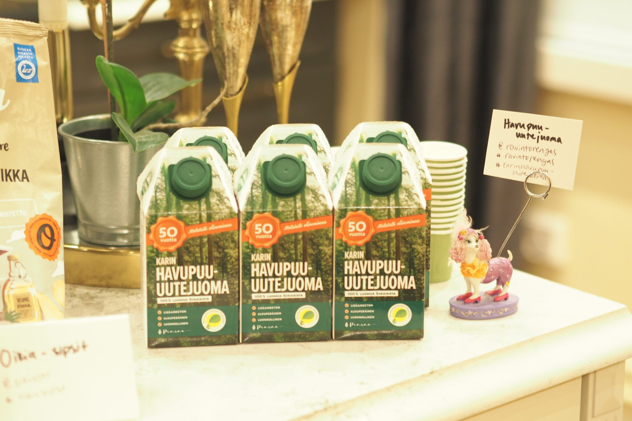 Toinen alkoholiton juoma oli Pinena by Ravintorengas Karin havupuu-uutejuoma, joka herätti aluksi ihmetystä, mutta lopulta sitä otettiin shotteina monta kierrosta! Tämä on todellinen super terveystuote, jolla on monia terveyshyötyjä. Havupuu-uutejuoma on ollut markkinoilla jo 50 vuotta. Se tutkittu ja palkittu kotimainen voittajatuote. Tuote sisältää muun muassa luomusertifioitua männynkuoriuutetta ja lähdevettä. Maku on mieto, hieman metsäinen. Juhlien jälkeen tätä naukkailtiin vielä höyrysaunassa. Täydellinen myös saunajuomana!