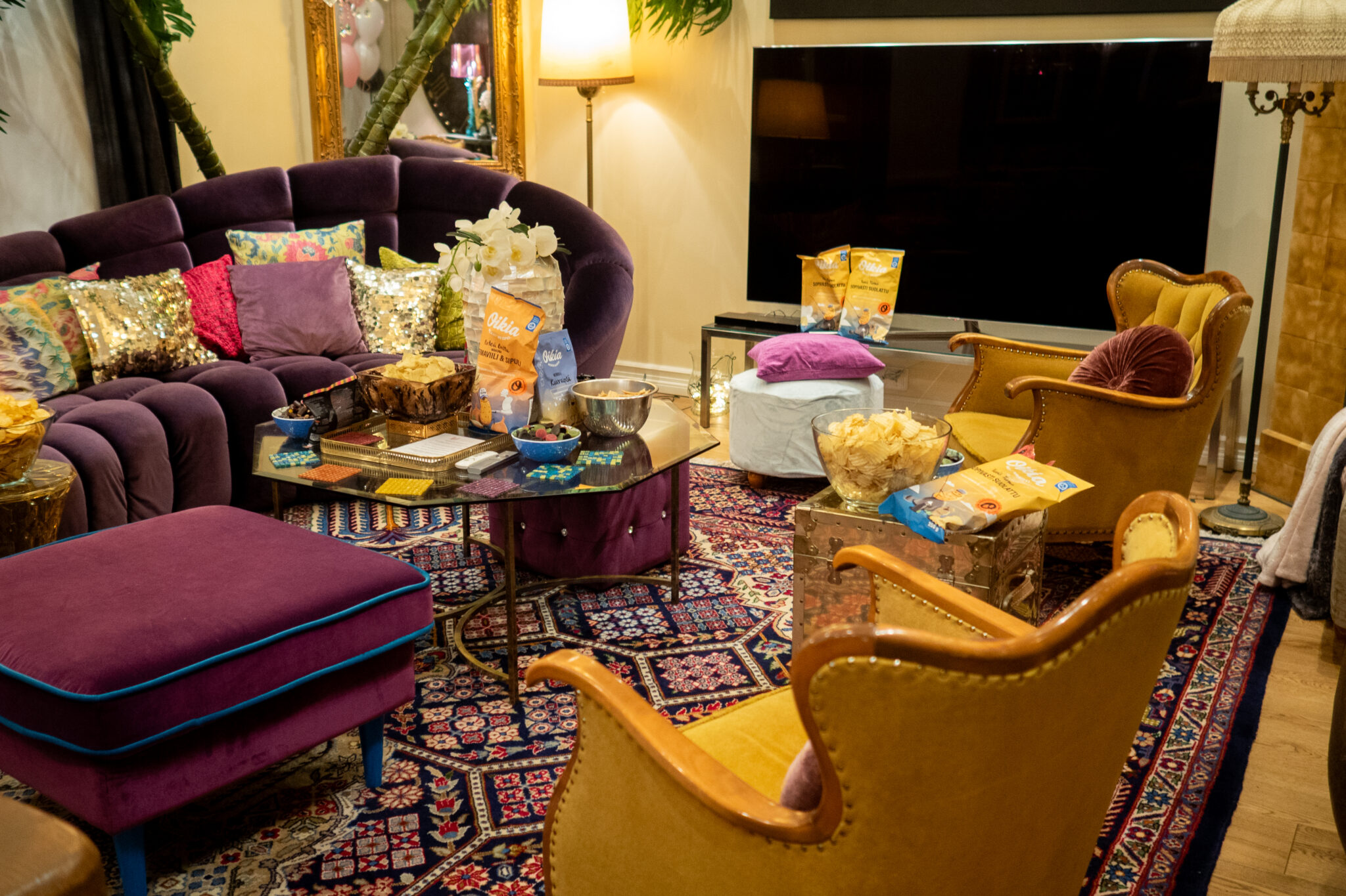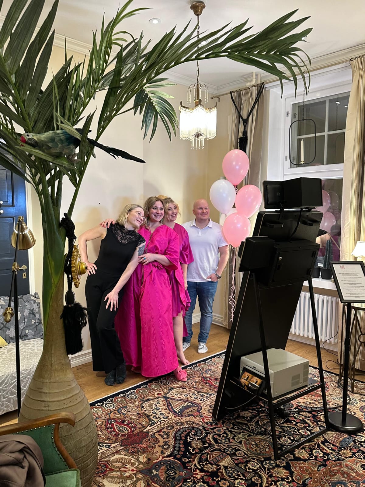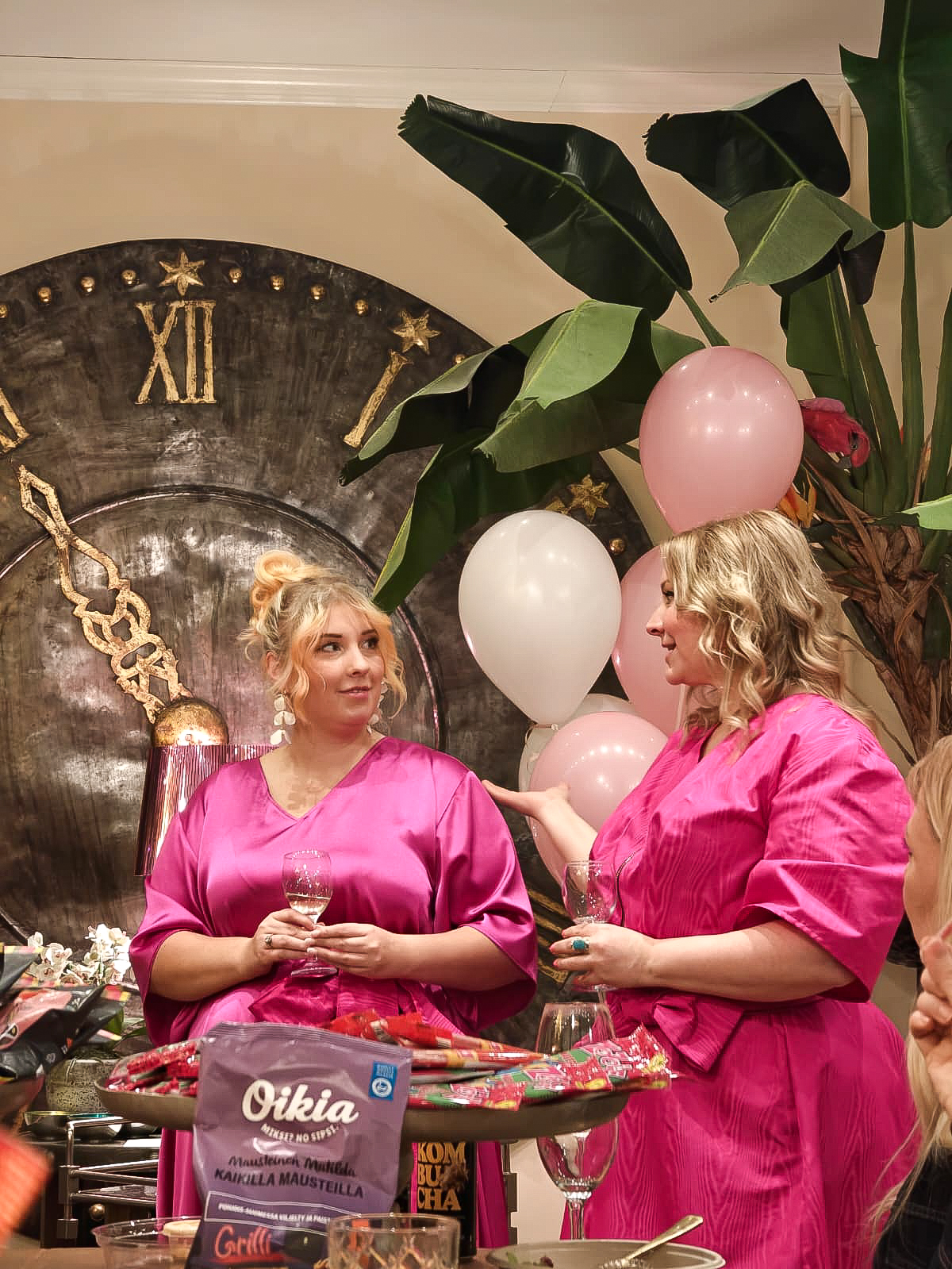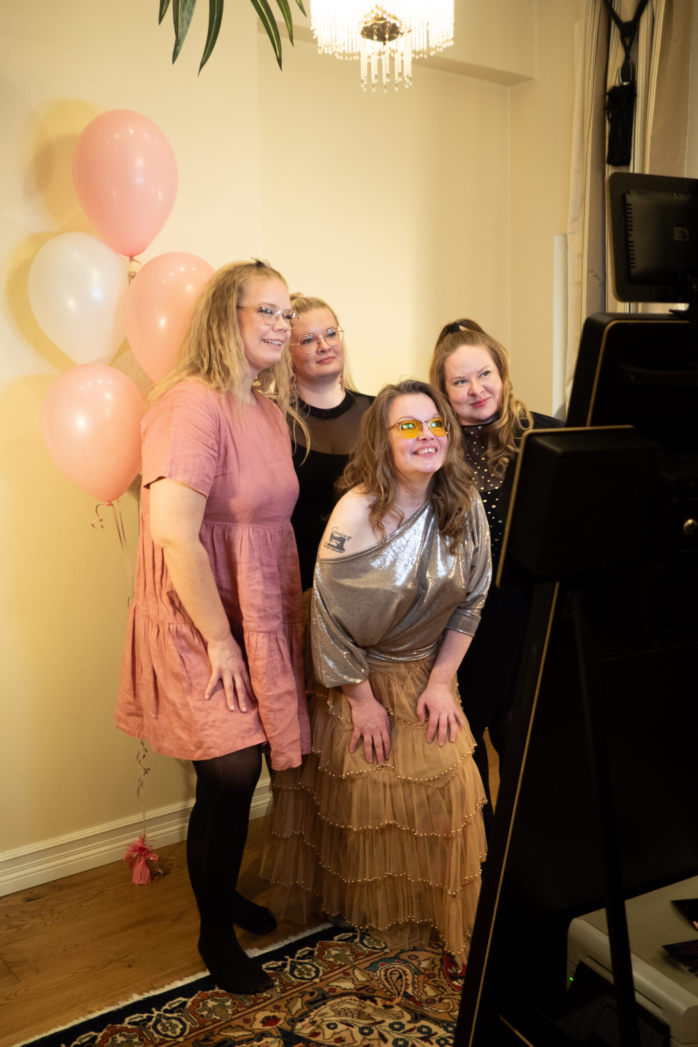 Juhlat järjestettiin Votto Boutique -asunnossa Helsingin keskustassa. Kyseessä oli yhden makuuhuoneen tilava luksusasunto, joka oli sisustettu todella upeasti ja näyttävästi. Asunto oli ihanteellinen meidän juhlille avaran tilan ja hyvän pohjaratkaisun puolesta. Koristeluun tai somistamiseen ei tarvinnut aikaa käyttää, sillä asunnossa oli niin upeita ja näyttäviä yksityiskohtia, joita ihasteltiin kilpaa. Ainot koristeet olivat Juhlamaailmasta saadut ilmapallot, jotka toivat toivotun ripauksen juhlan tunnetta ja toimivat rekvisiittana kuvausseinällä.
