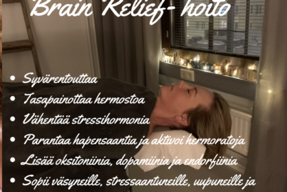 syvärentouttava brain relief- hoito Brain Relief on uudehko Suomessa kehitetty hoito, jonka tavoitteena on syvä rentoutuminen. Brain Relief- hoito…